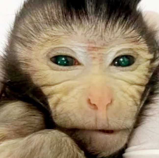 El mono, un macaco cangrejero, presentaba una fluorescencia verde en el cerebro y los ojos, lo que confirma el uso de una combinación de un embrión normal y células madre en su creación.